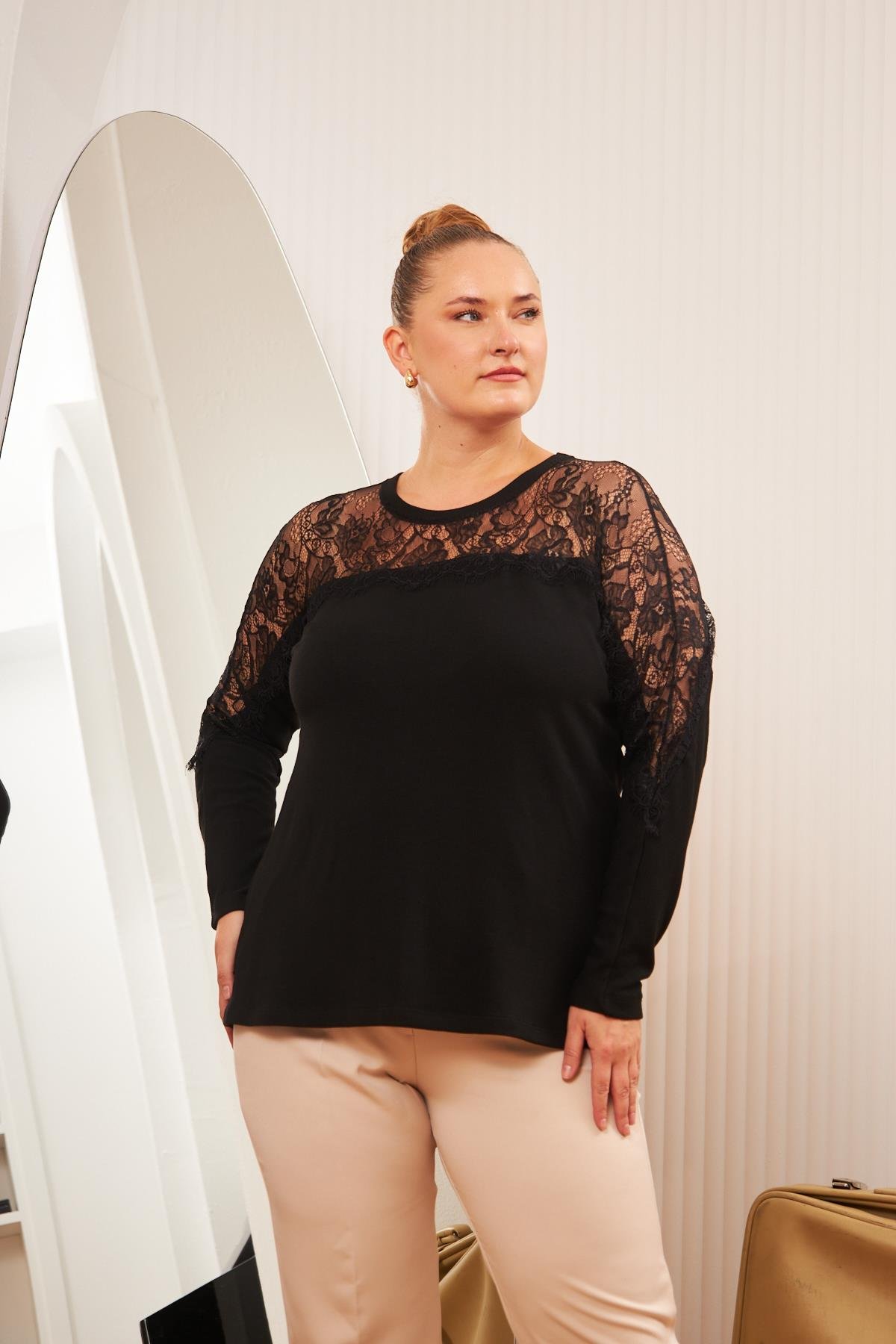 Büyük Beden Dantel Detay Bluz Siyah (O6503-SİYAH)