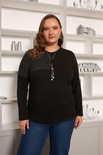 Büyük Beden File ve Kolye Detay Bluz Siyah