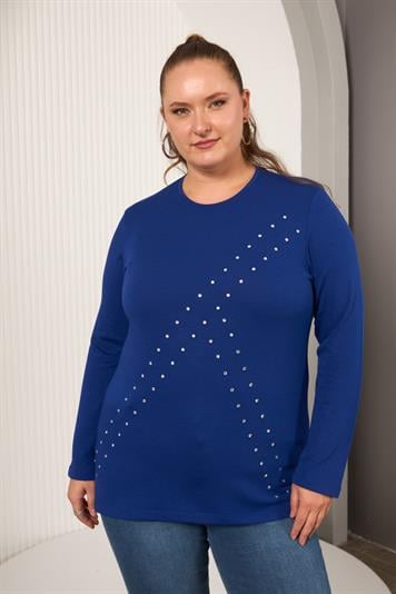 Büyük Beden Geometrik Taşlı Bluz Saks (O6755-SAKS)
