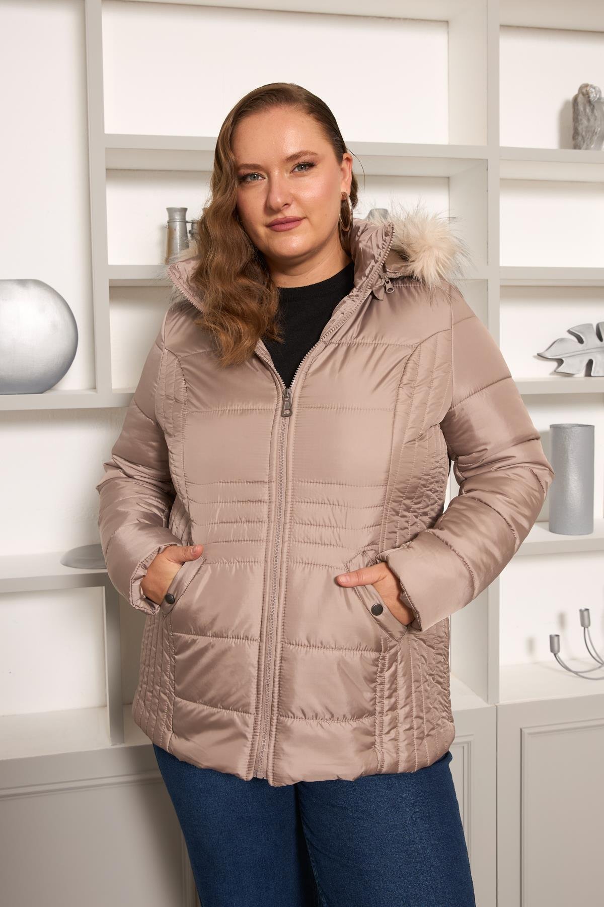 Büyük Beden Kapitone Şişme Mont Astarlı Vizon