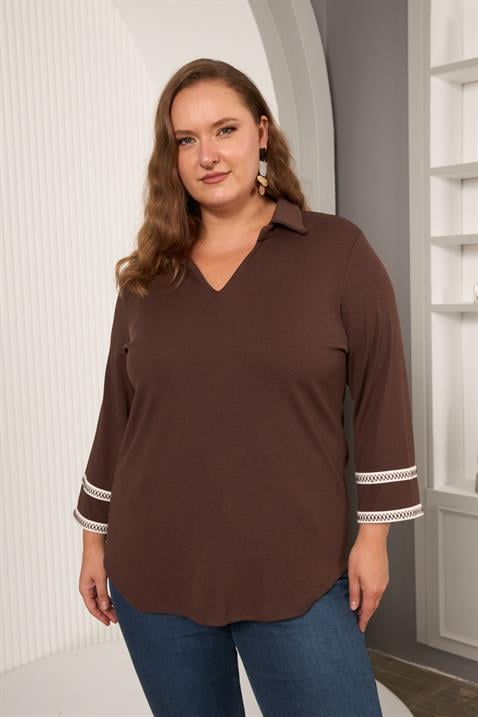 Büyük Beden Kol Nakış Detay Örme Bluz Kahverengi (O6741-KAHVE)