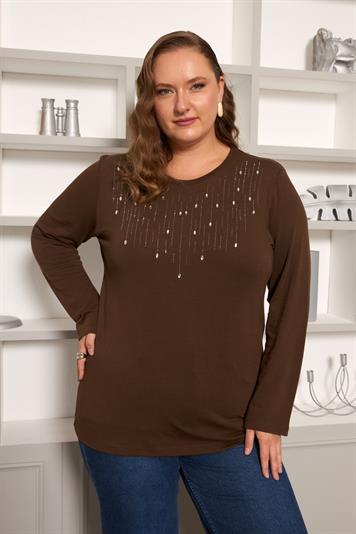 Büyük Beden Önü Taş Detay Bluz Kahve (O6753-KAHVE)