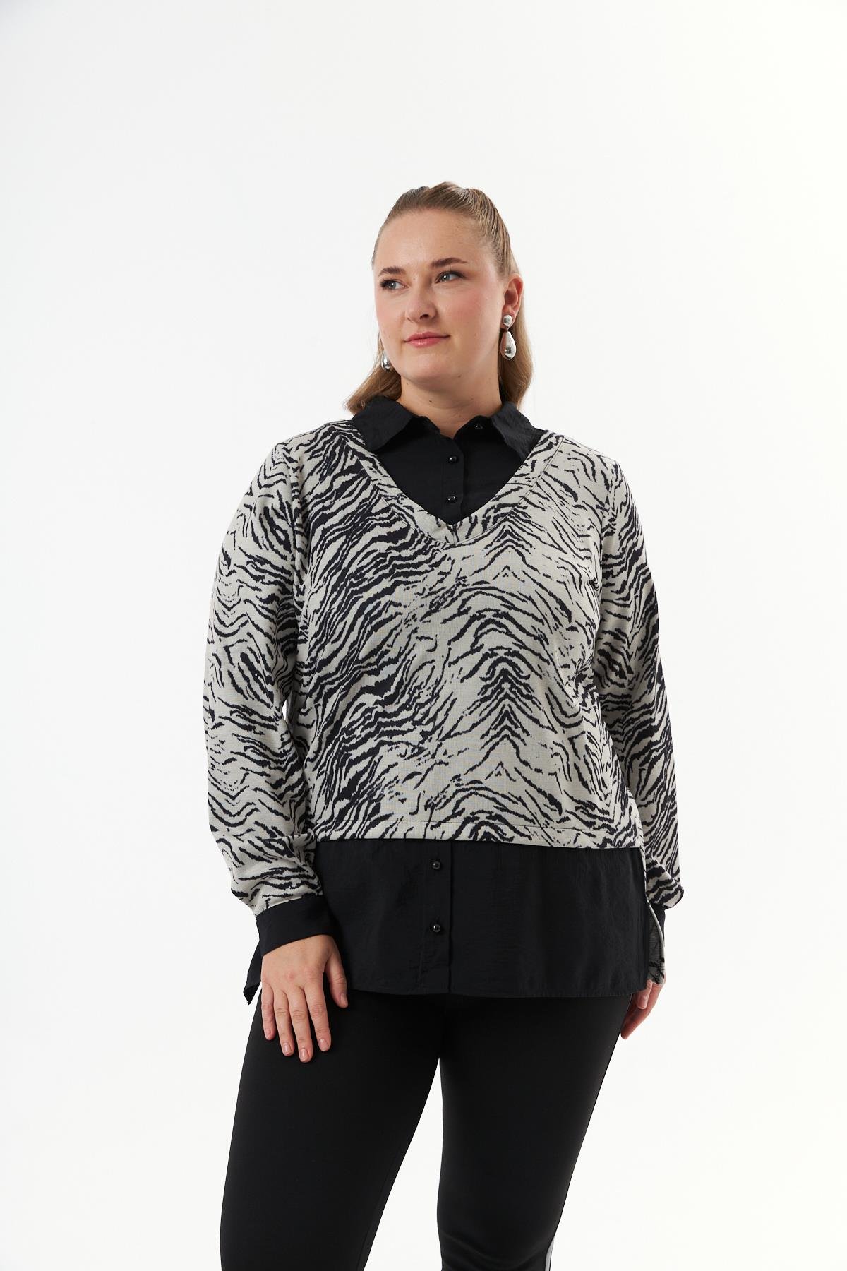 Büyük Beden Poplin Garnili Triko Bluz Bej