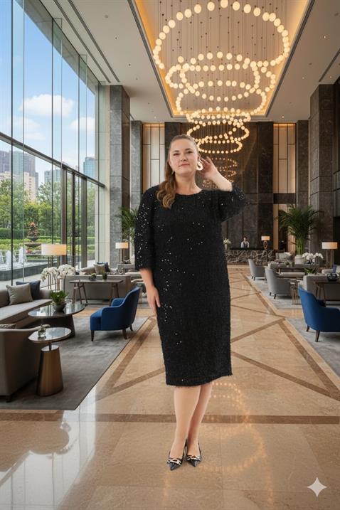 Büyük Beden Pul Payet Kırçıllı Abiye Elbise Siyah (O6524-SİYAH)