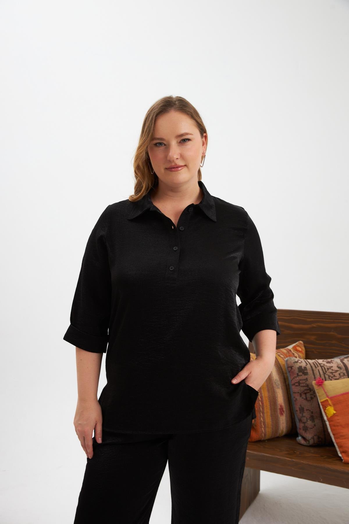 Büyük Beden Simli Gömlek Yaka Bluz Siyah (O6730-SİYAH)