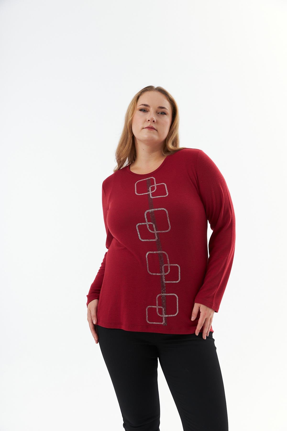 Büyük Beden Taş Detaylı Triko Kazak Bordo (O6539-BORDO)