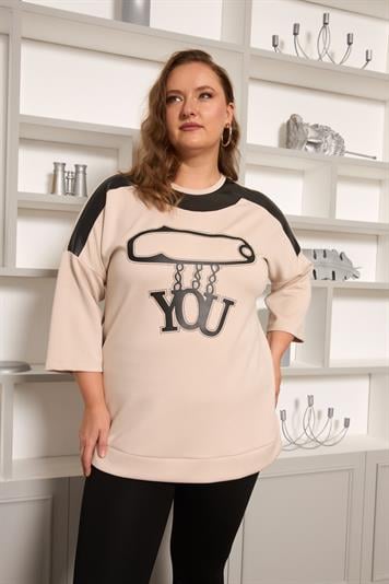 Büyük Beden Taş ve Deri Detaylı Bluz Krem (O6746-KREM)