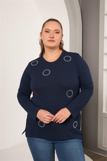 Çember Taş İşlemeli Büyük Beden Bluz Lacivert (O6768-LACİVERT)