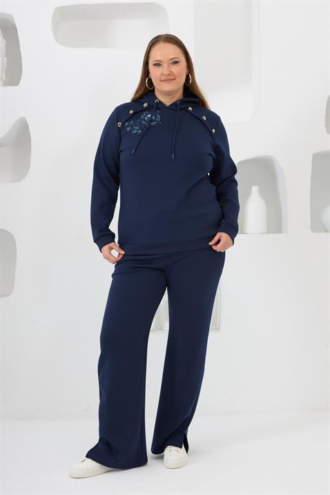 Çiçek Aplikeli Büyük Beden Kapüşonlu Eşofman Takımı Lacivert (O6744-LACİVERT)