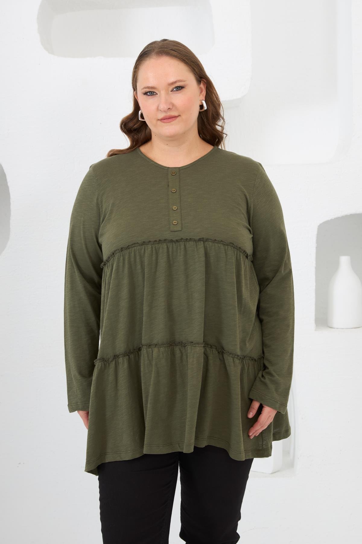 Düğme Detaylı Fırfırlı Büyük Beden Tunik Haki (O6788-HAKİ)