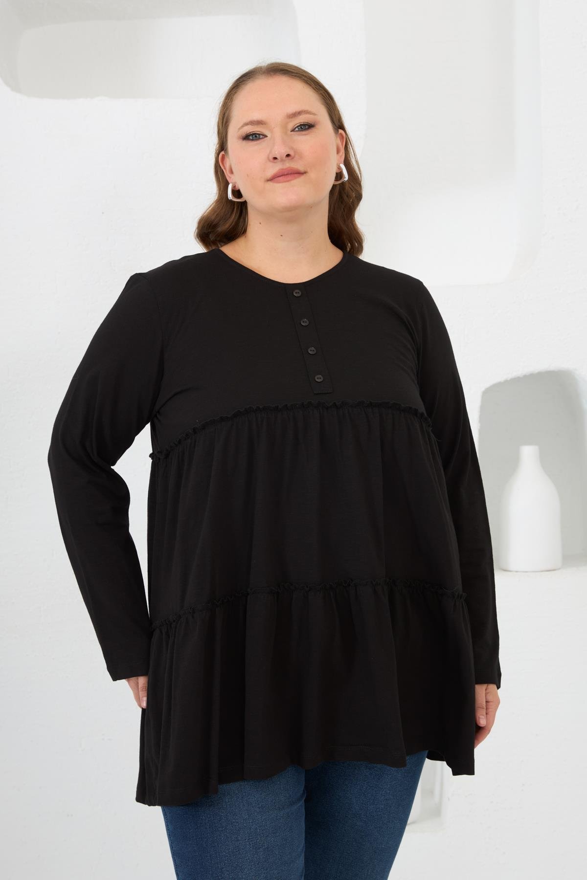 Düğme Detaylı Fırfırlı Büyük Beden Tunik Siyah (O6788-SİYAH)
