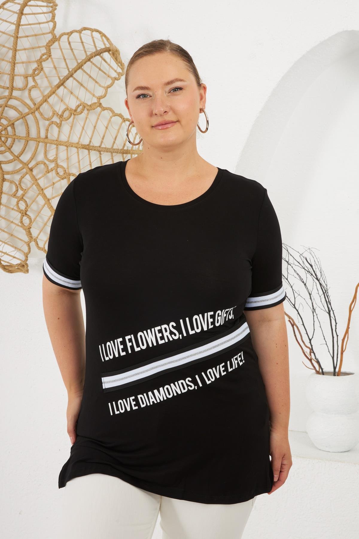 İ Love Baskılı Büyük Beden Tişört Siyah (O6731-SİYAH)