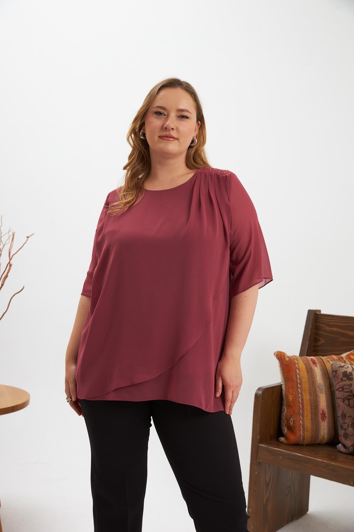Omuz Taş Detaylı Asimetrik Kesim Büyük Beden Şifon Bluz Gülkurusu (O6705-GÜLKURUSU)