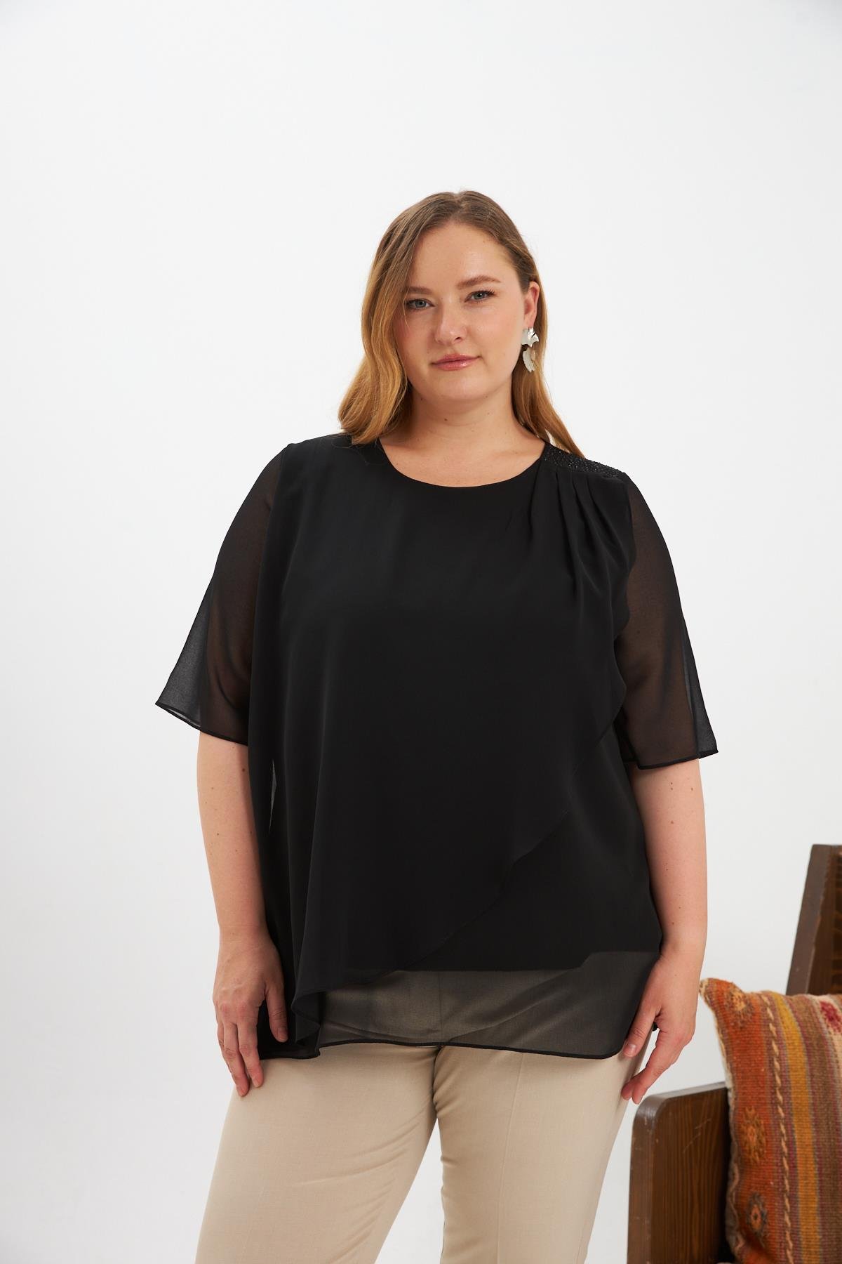 Omuz Taş Detaylı Asimetrik Kesim Büyük Beden Şifon Bluz Siyah (O6705-SİYAH)