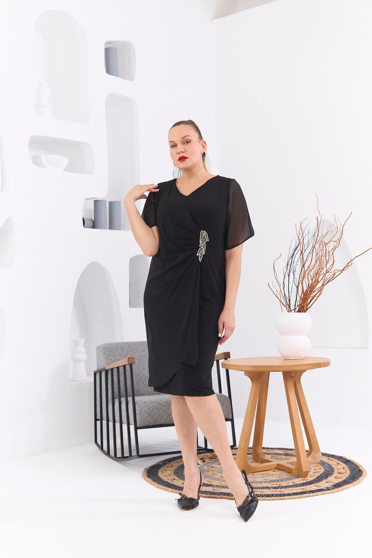 Asimetrik Büyük Beden Taş Aksesuarlı Siyah Abiye Elbise (O6318-SİYAH)