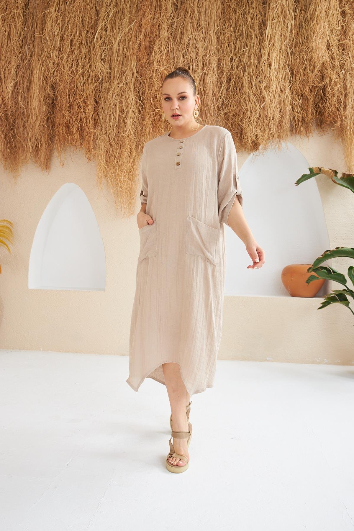Asimetrik Kesim Cepli Büyük Beden Vizon Elbise