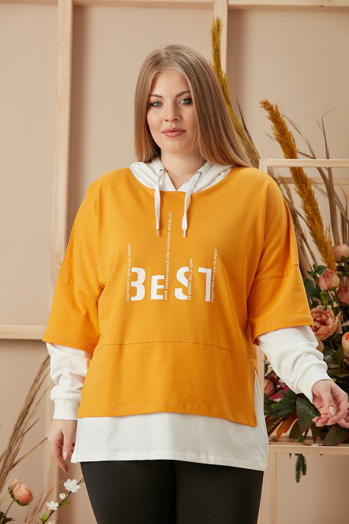 Rmg Baskılı Kapşonlu Hardal Büyük Beden Sweatshirt
