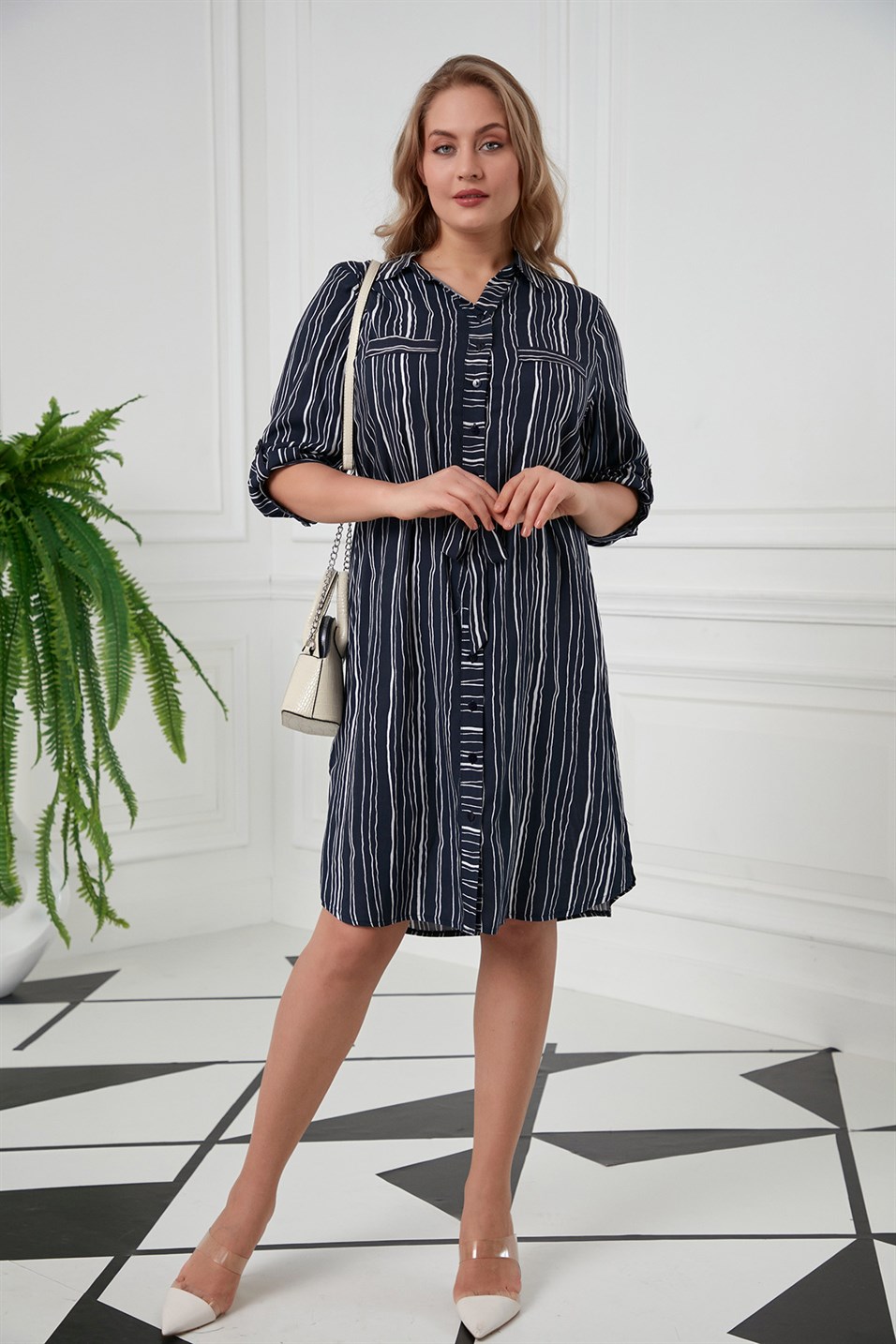 RMG Bel Bağcık Detaylı Çizgili Büyük Beden Lacivert Gömlek Elbise (O4148-LACİVERT)