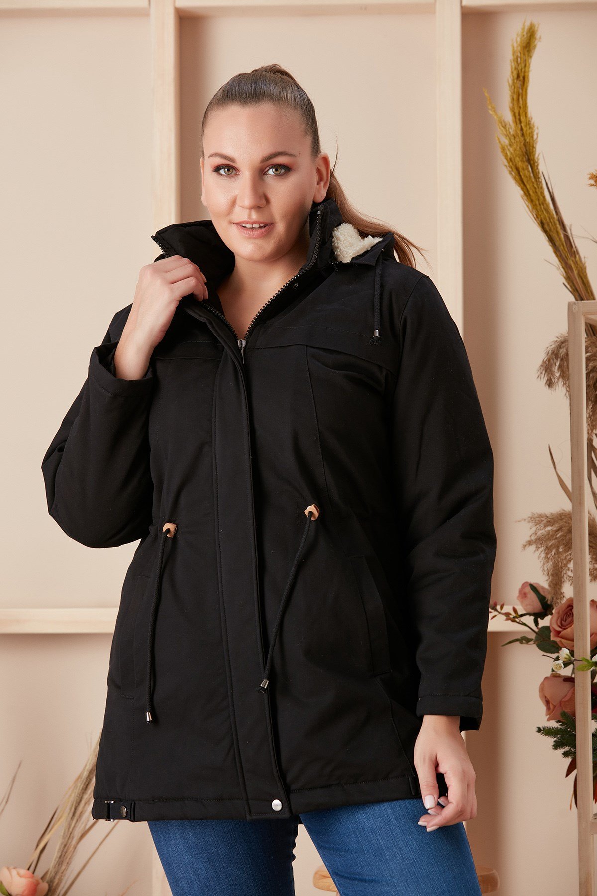Bel Bağcık Detaylı Kapşonlu Büyük Beden Siyah Kaban (9755-SİYAH)