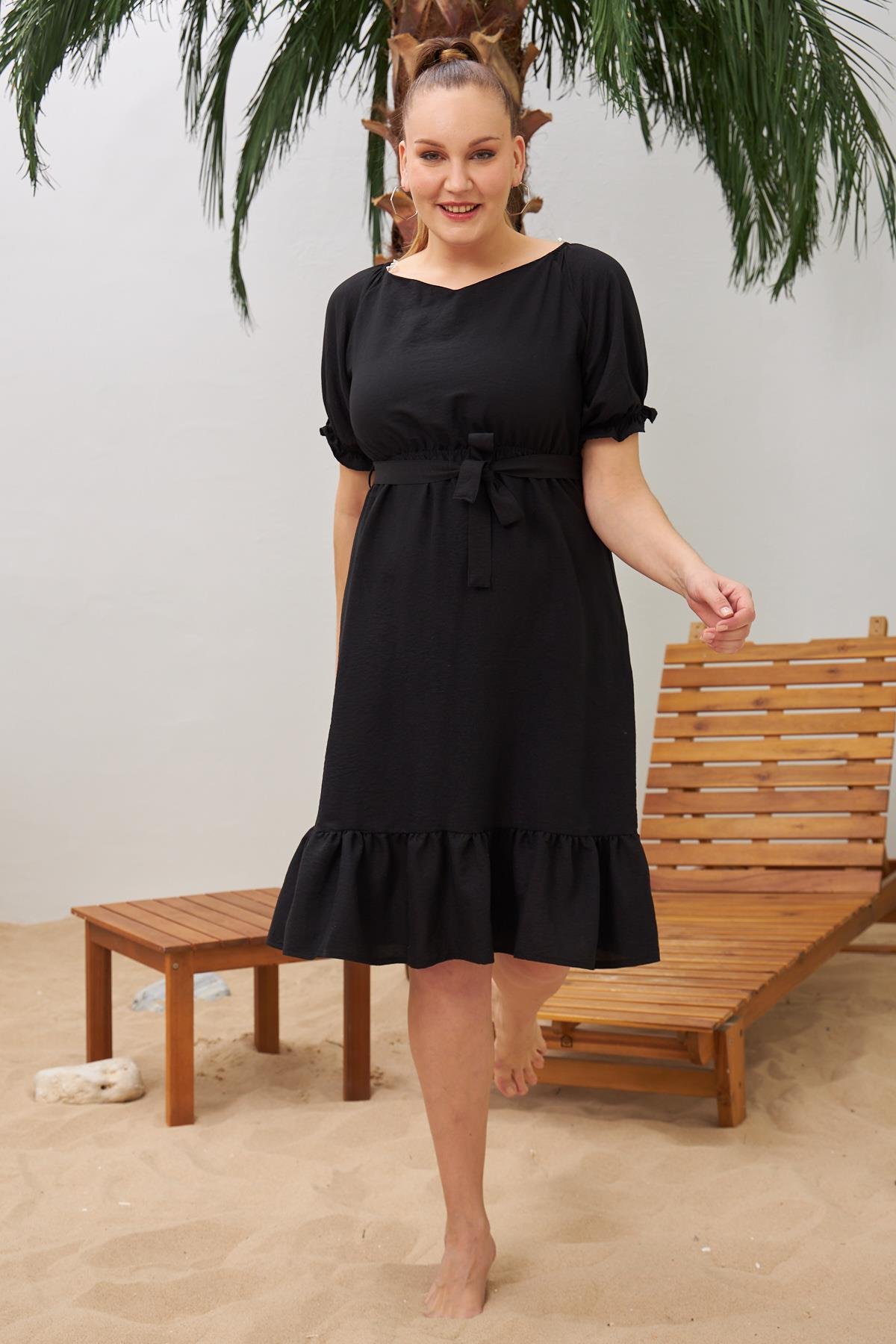 Rmg Beli Lastikli Eteği Fırfırlı Büyük Beden Siyah Elbise
