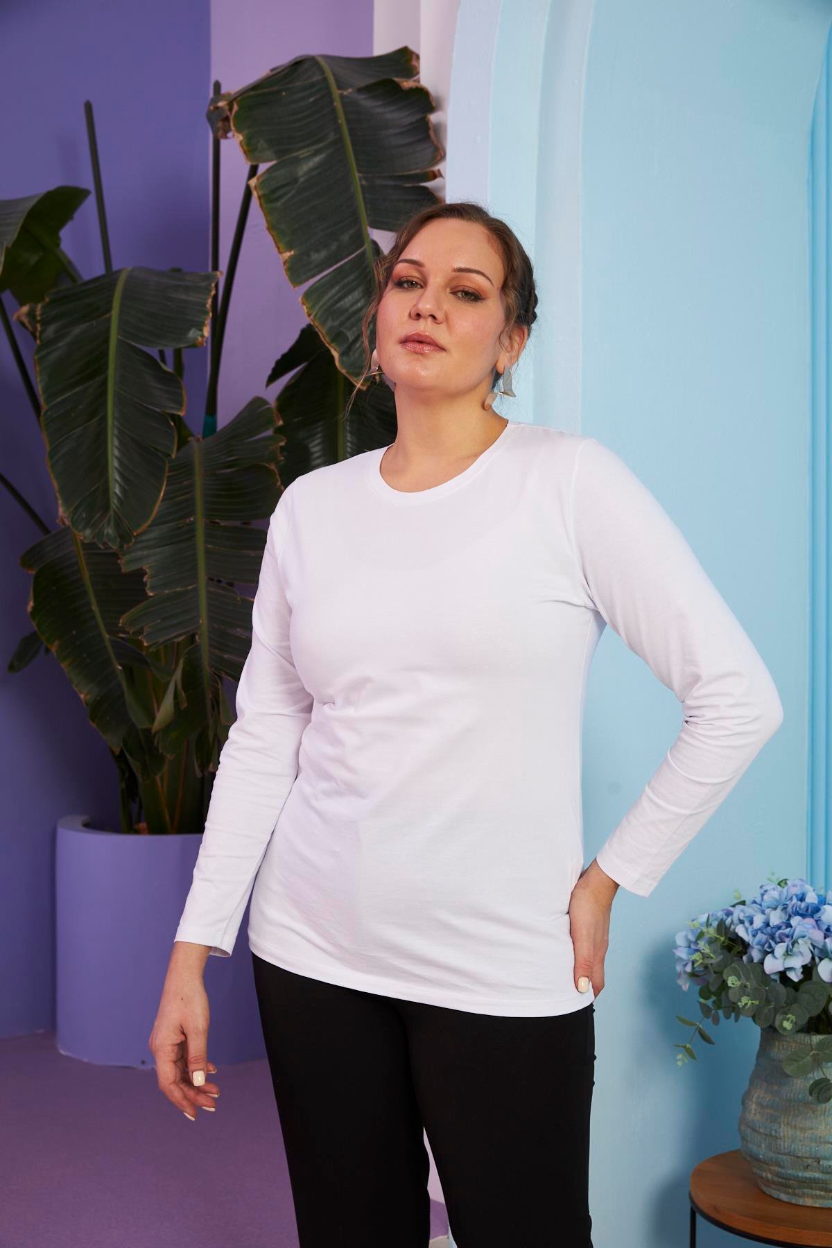 Bisiklet Yaka Uzun Kol Büyük Beden Beyaz Tişört (O4032-BEYAZ)