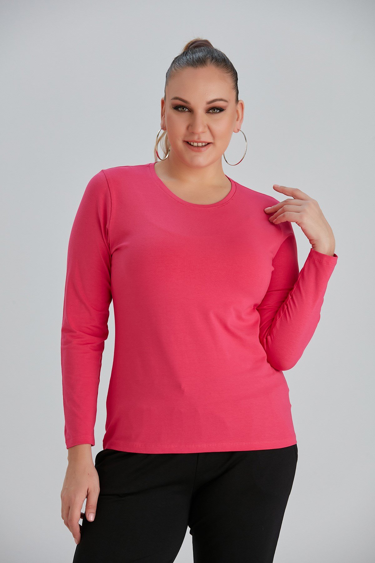 Rmg Bisiklet Yaka Uzun Kol Büyük Beden Fuşya Tişört (O4032-FUŞYA)