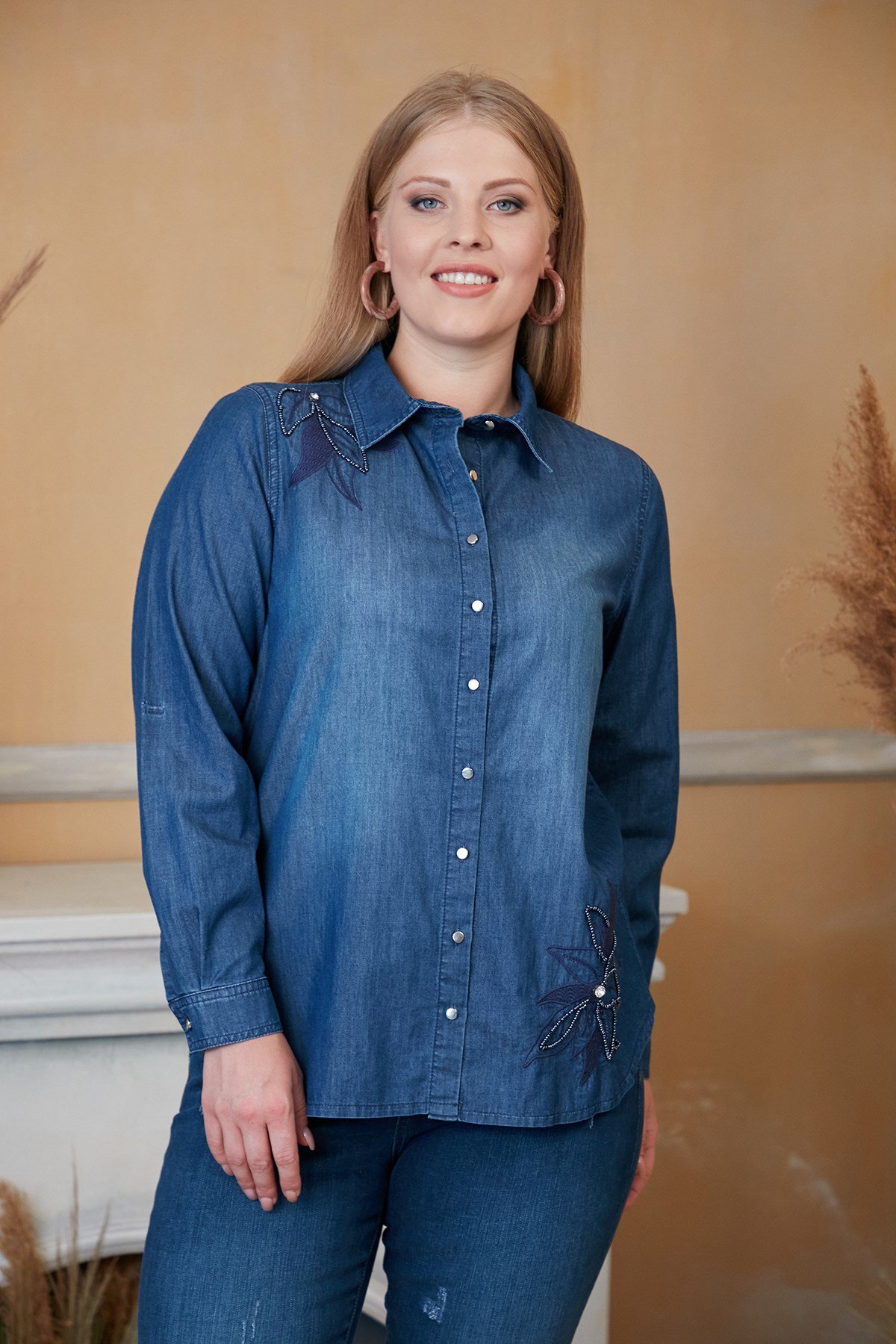 Rmg Boncuk Ve Aplike İşlemeli Büyük Beden Mavi Kot Gömlek