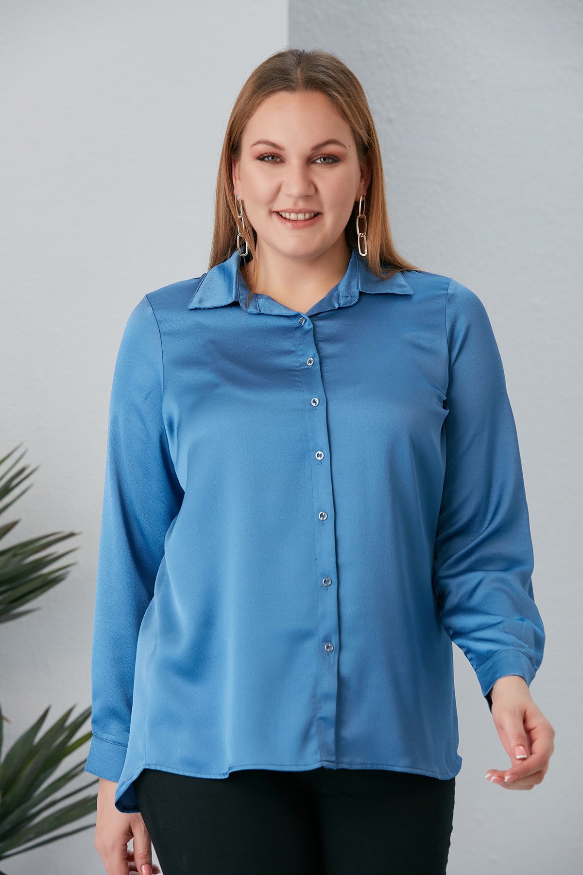 Rmg Büyük Beden Mavi Saten Gömlek