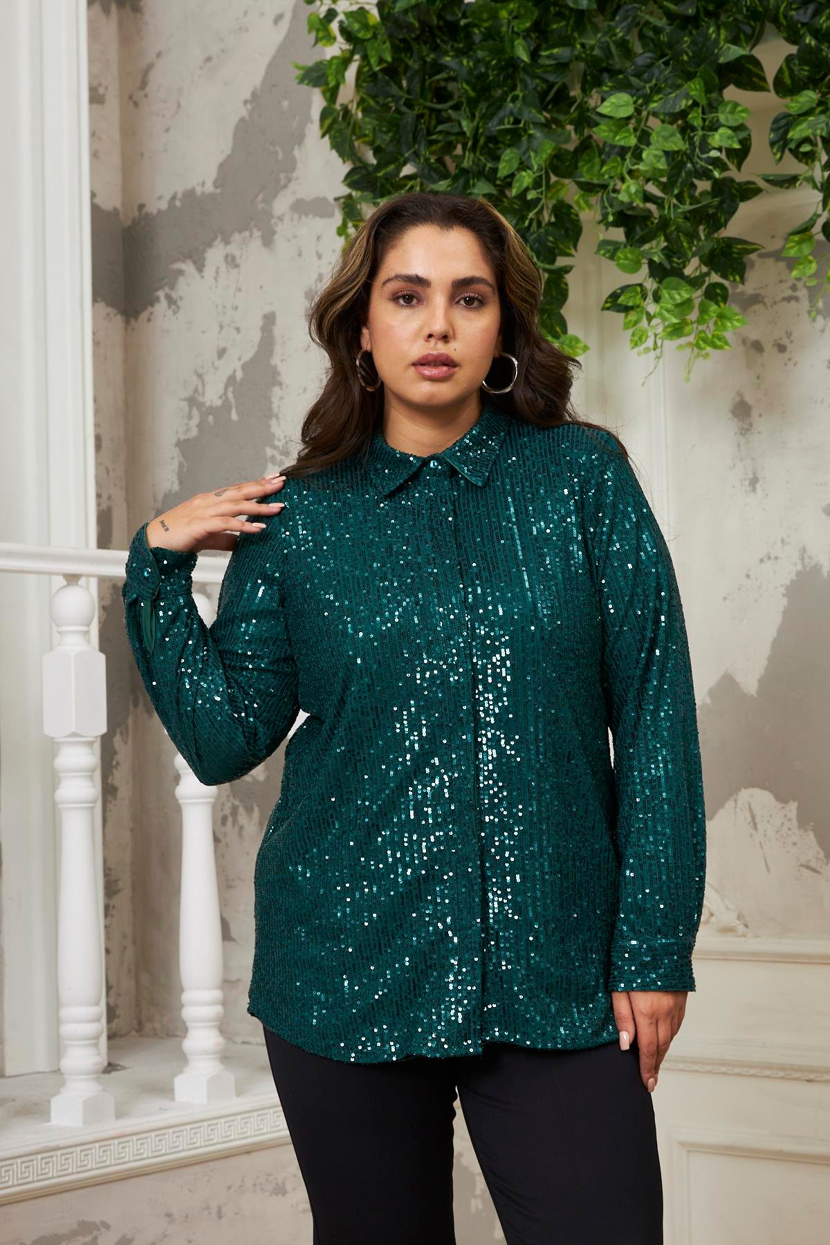 Büyük Beden Pul Payet Zümrüt Gömlek