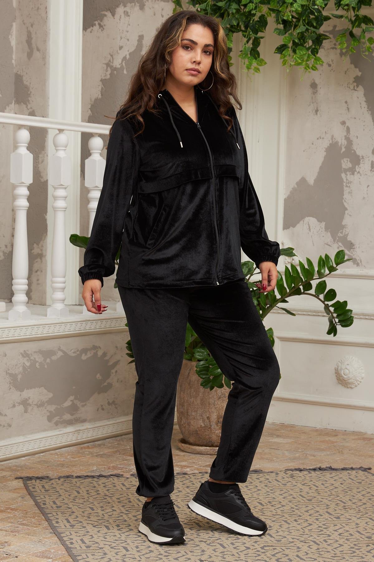 Büyük Beden Siyah Kadife Eşofman Takımı