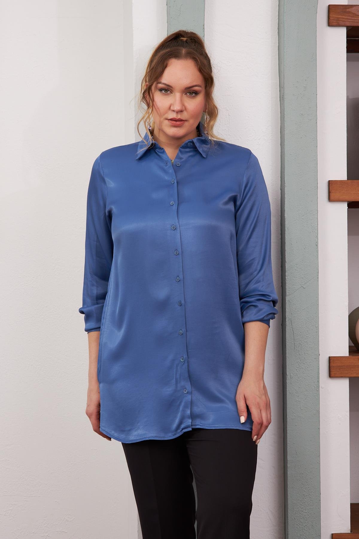 Büyük Beden Uzun İndigo Saten Gömlek (O6064-İNDİGO)