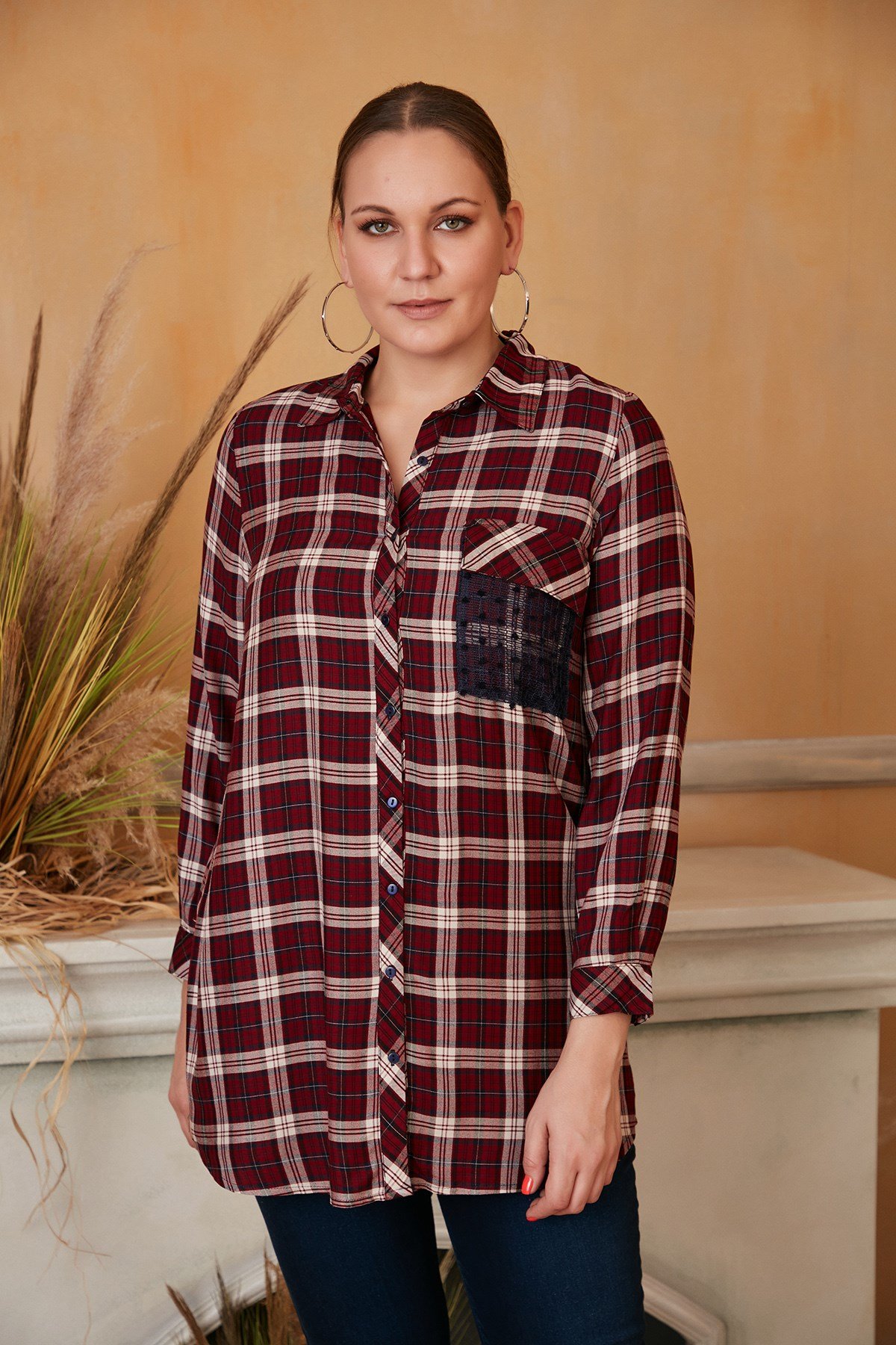 RMG Cep Dantel Detaylı Büyük Beden Bordo Gömlek (O4407-BORDO)