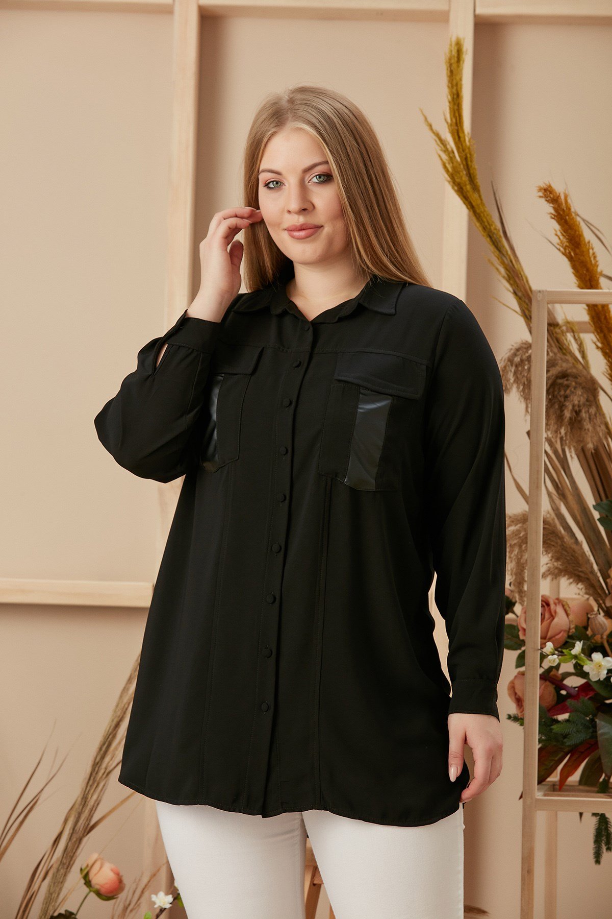 Rmg Cep Deri Detaylı Büyük Beden Siyah Gömlek (O4742-SİYAH)