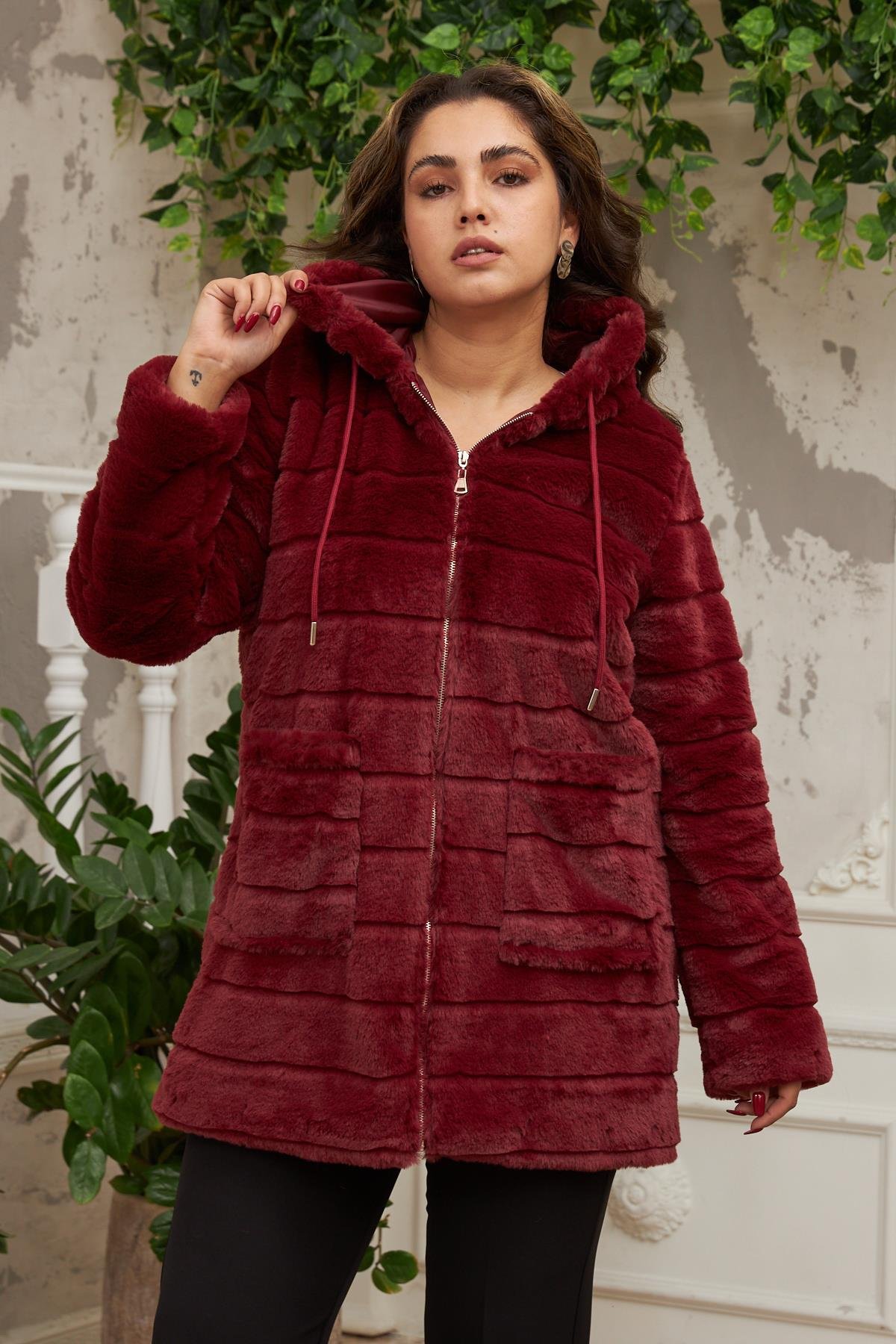 Cep Detaylı Büyük Beden Uzun Bordo Peluş Mont (9778-BORDO)