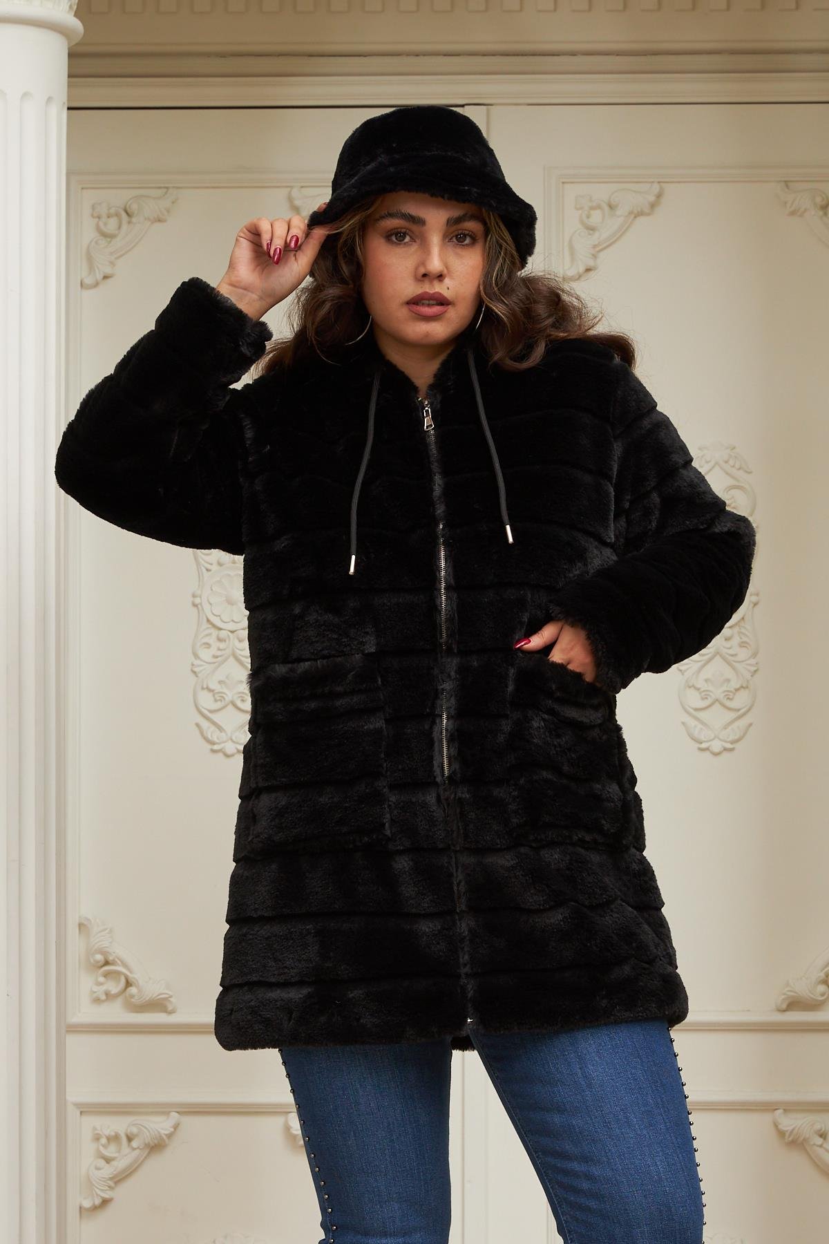 Cep Detaylı Büyük Beden Uzun Siyah Peluş Mont