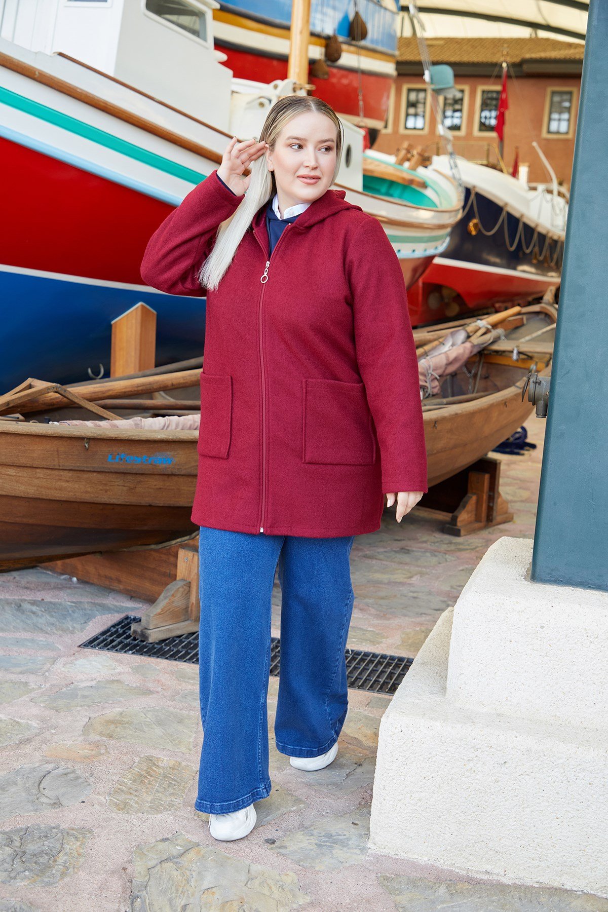 Rmg Cep Detaylı Kapşonlu Büyük Beden Bordo Keçe Ceket (9774-BORDO)