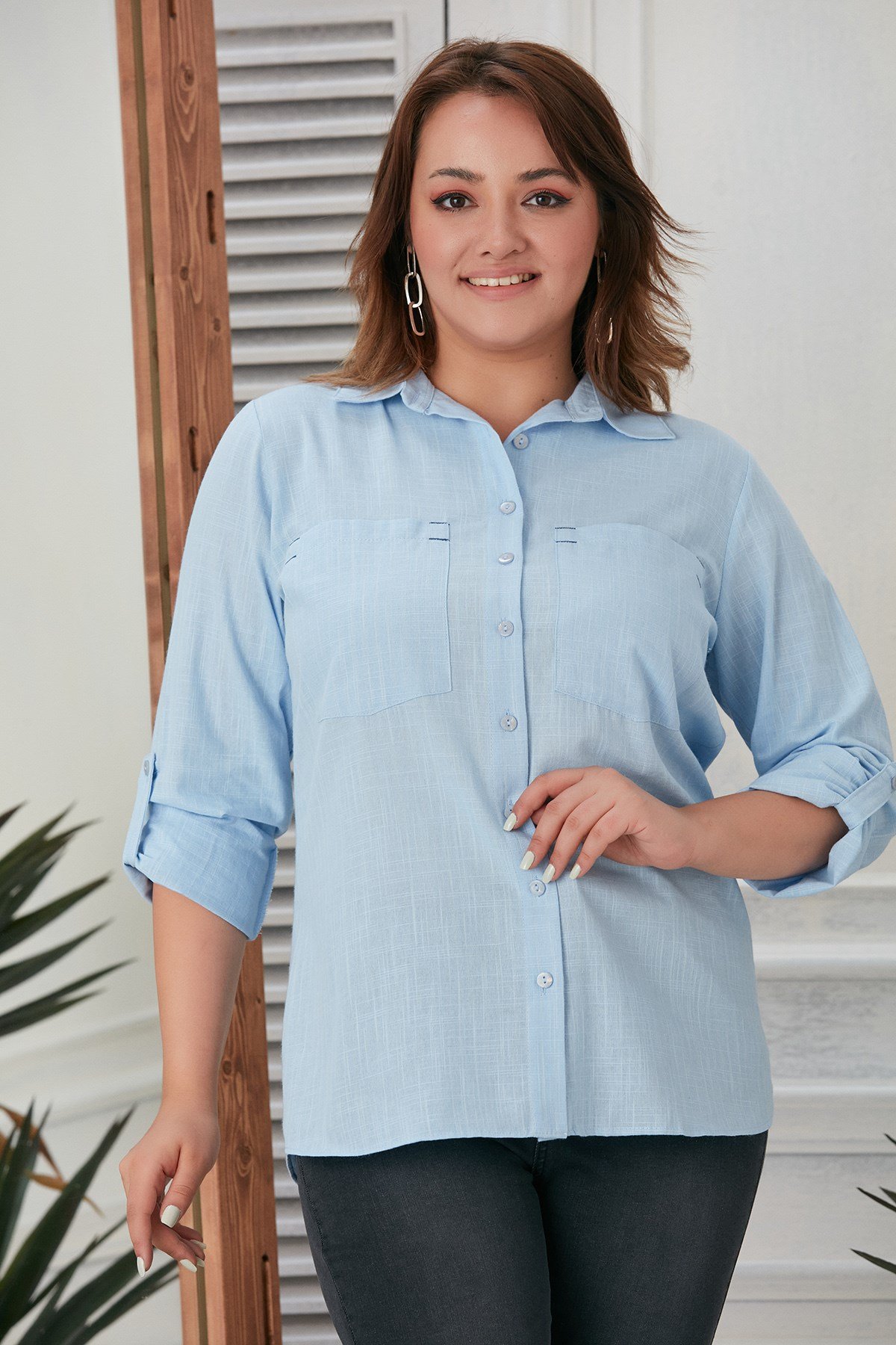 Rmg Cep Nakış Detaylı Büyük Beden Bebemavi Pamuk Gömlek (O4994-BEBE MAVİ)