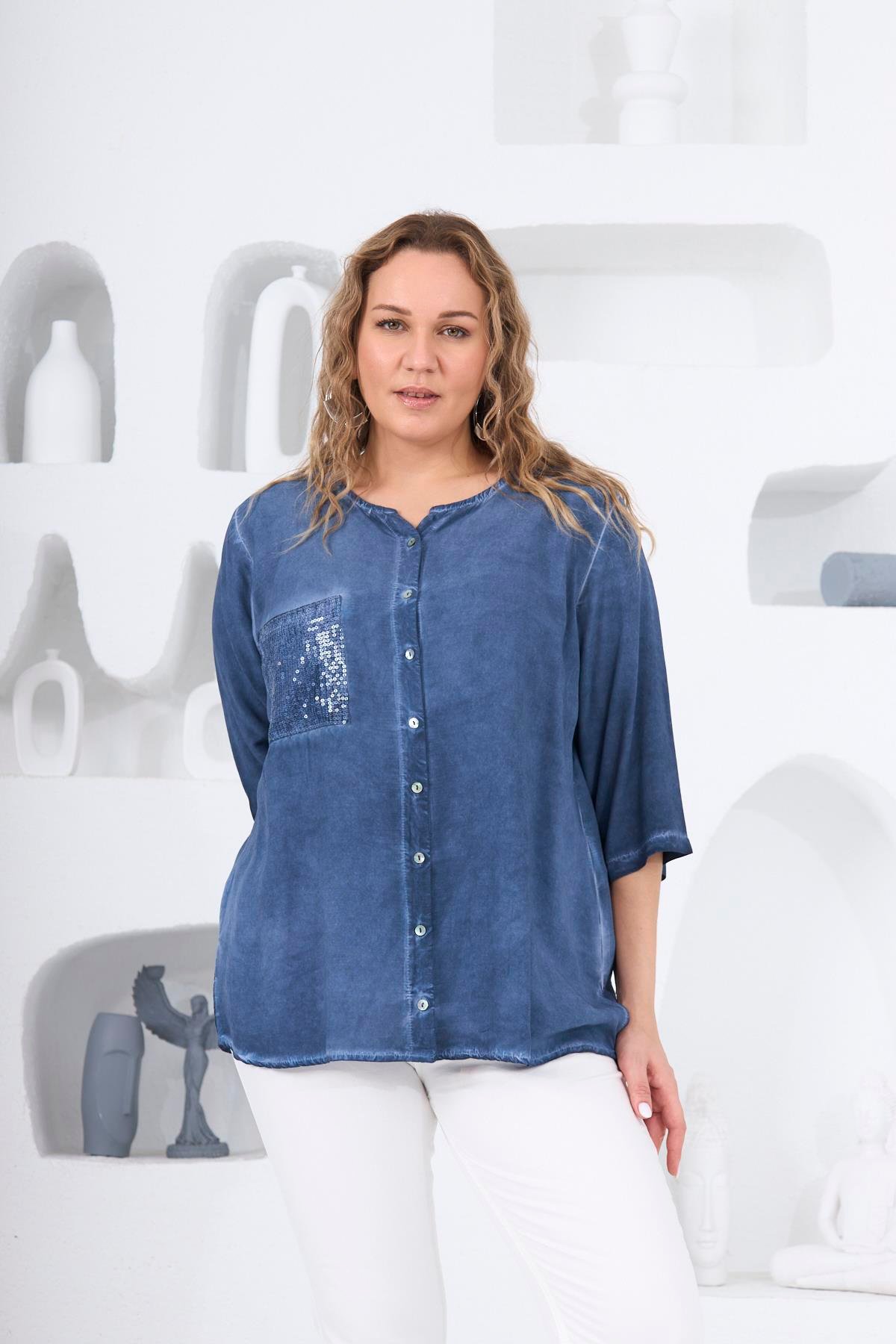 Cep Pulpayet Detaylı Yırtmaçlı İndigo Büyük Beden Yıkamalı Bluz (O6337-İNDİGO)