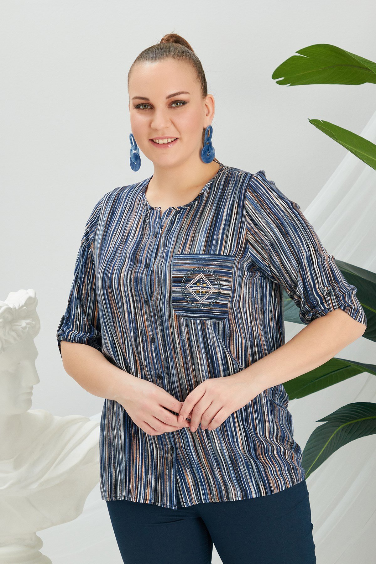 Rmg Cep Taş Baskılı Çizgili Büyük Beden Lacivert Gömlek