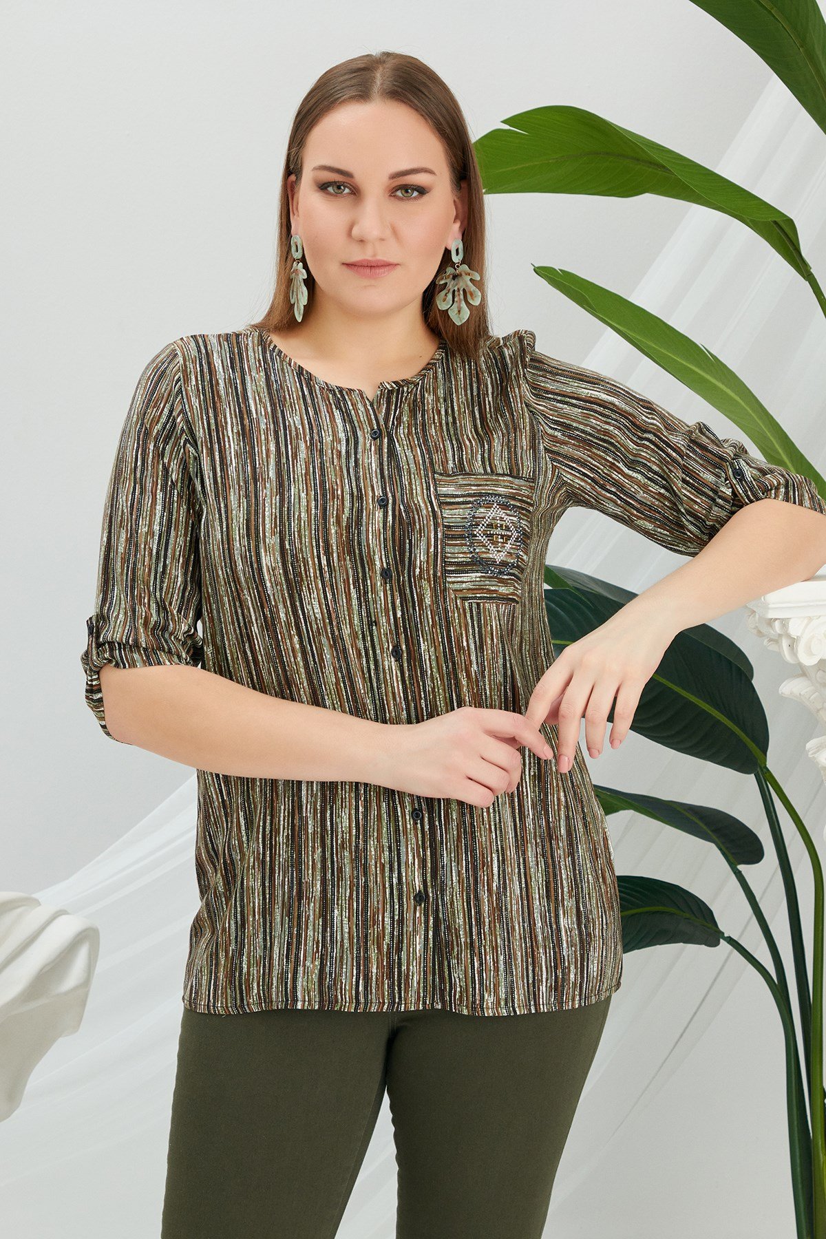 Rmg Cep Taş Baskılı Hakim Yaka Büyük Beden Haki Gömlek