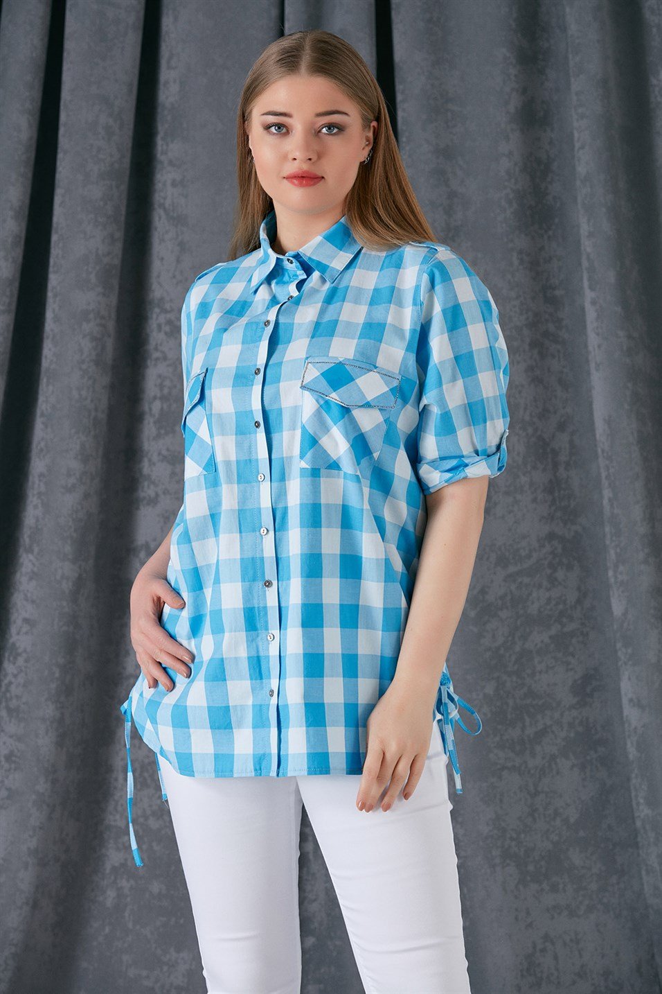 Rmg Cepleri Taş Detaylı Yanları Büzgülü Büyük Beden Ekose Gömlek (6627Y-TURKUAZ)