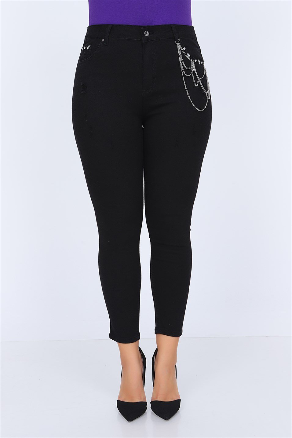 Rmg Cepleri Taş Ve Zincir Detaylı Büyük Beden Kot Pantolon (1460-SİYAH)