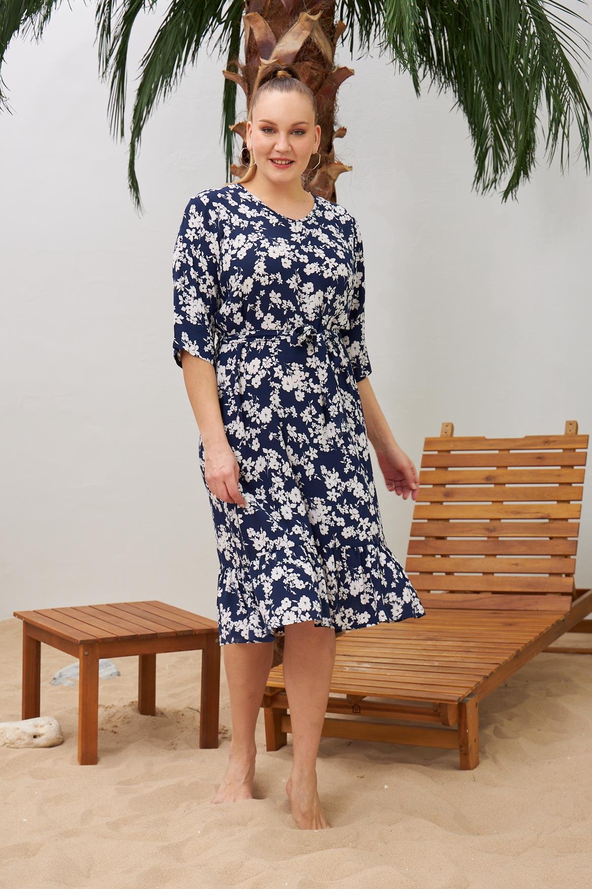Rmg Çiçek Desenli Bel Kuşak Detaylı Büyük Beden Lacivert Elbise