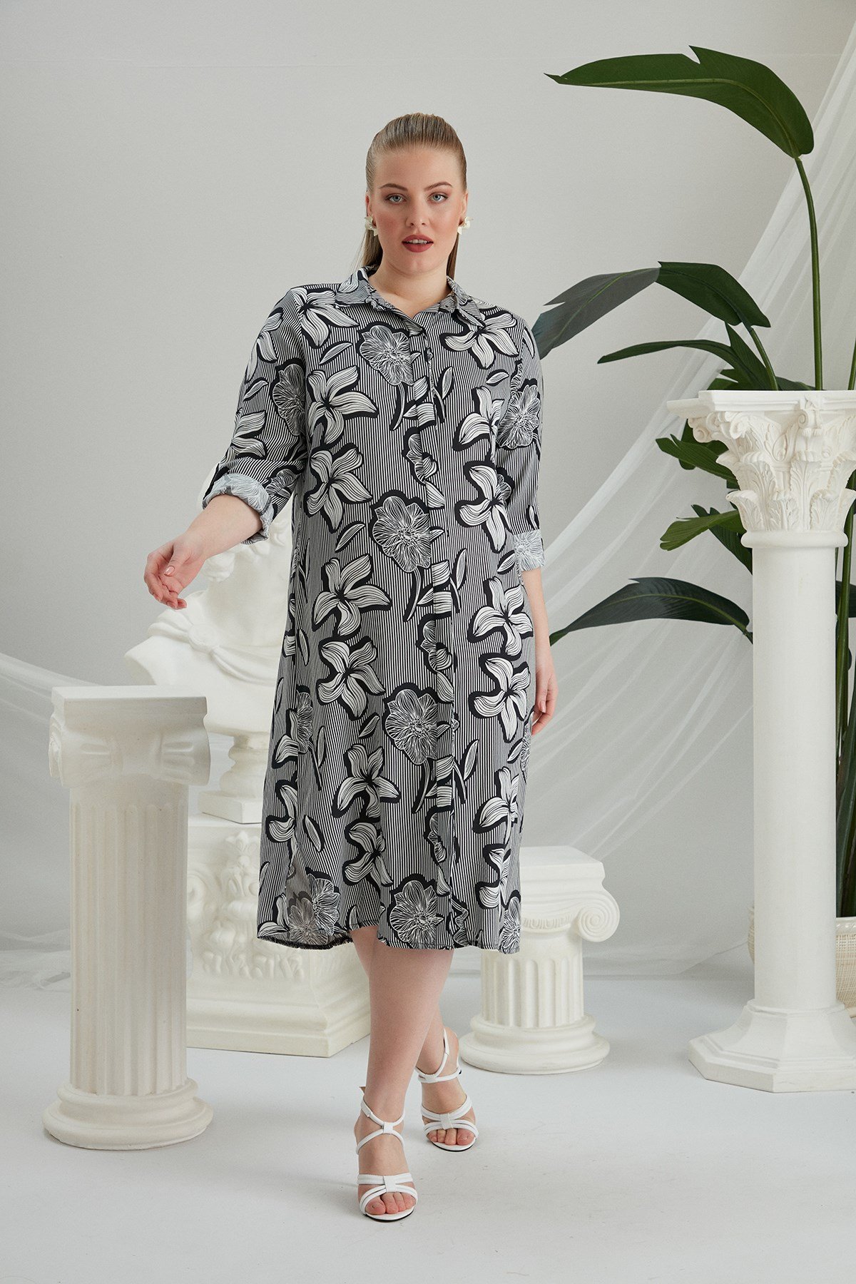 Rmg Çiçek Desenli Çizgili Büyük Beden Siyah Elbise