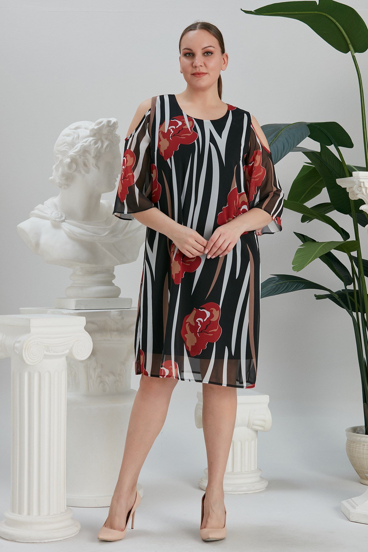 Rmg Çiçek Desenli Omuz Detaylı Büyük Beden Siyah Şifon Elbise