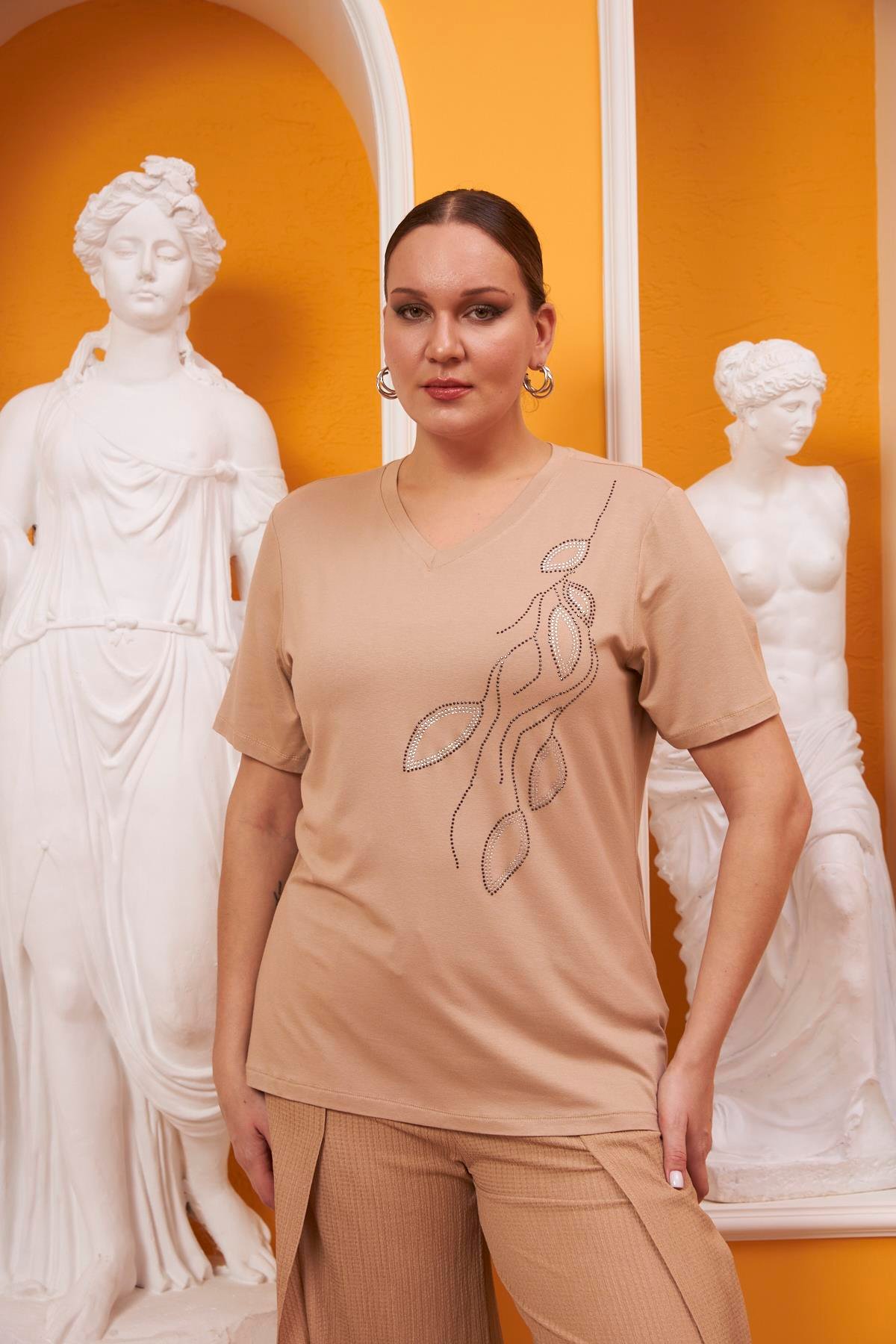 Çiçek Desenli Taş Baskılı Büyük Beden Vizon Tişört (O6287-VİZON)