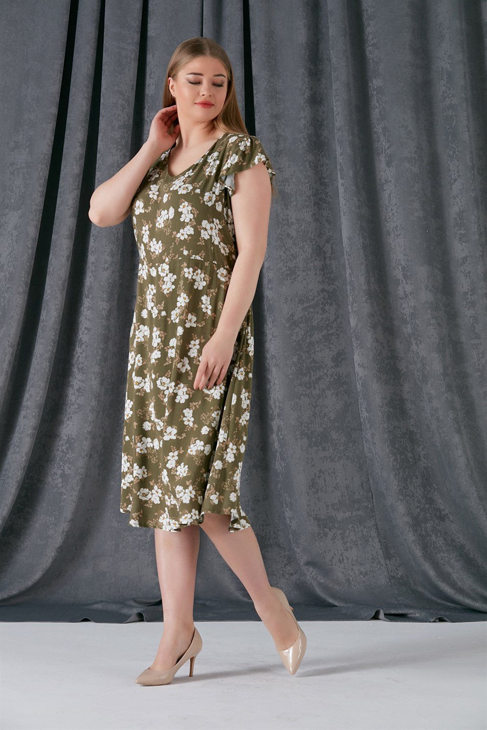 Rmg Çiçek Desenli V Yaka Büyük Beden Elbise (6570Y-HAKİ)