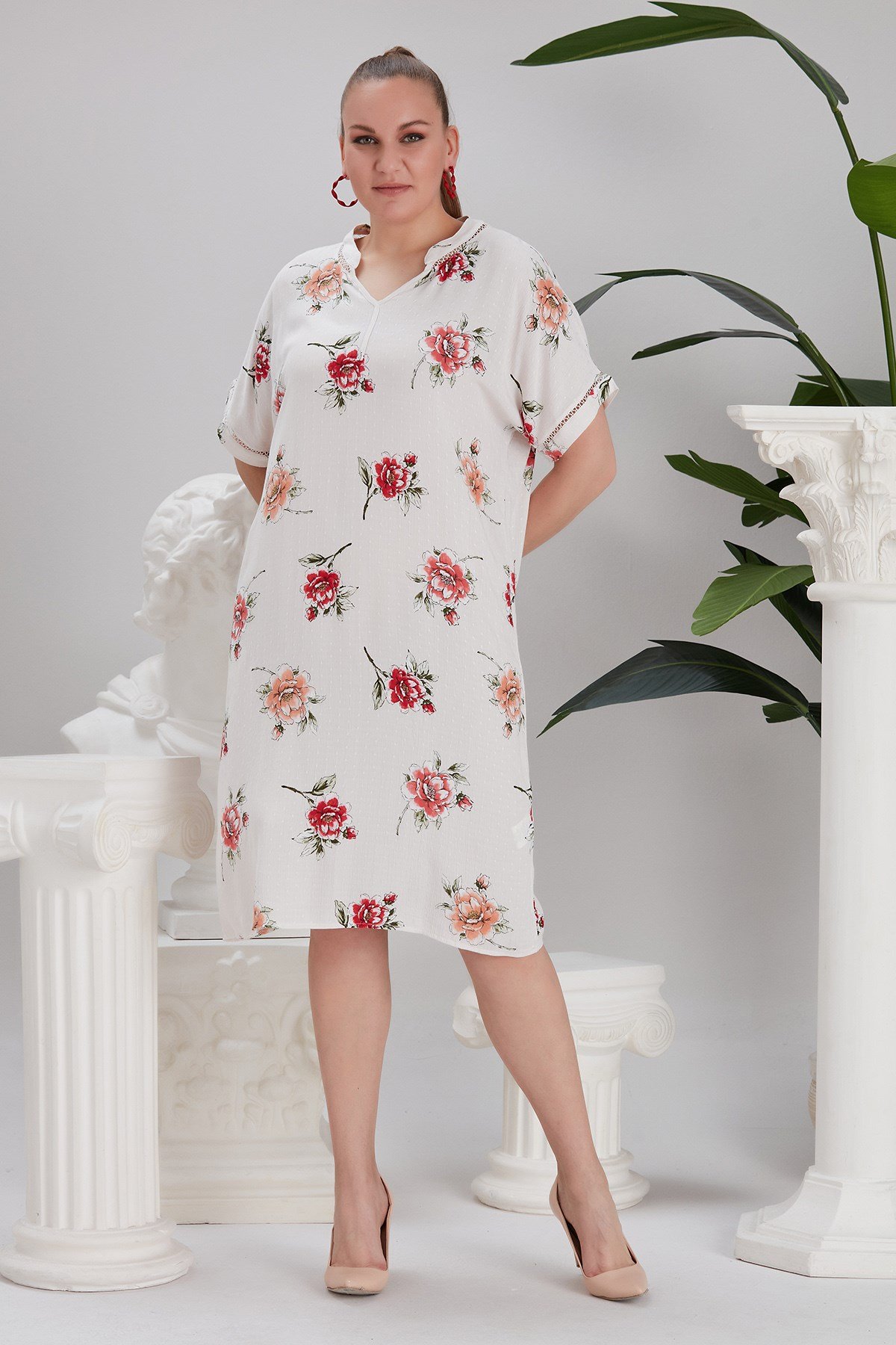 Rmg Çiçek Desenli Yaka Detaylı Büyük Beden Beyaz Viskon Elbise