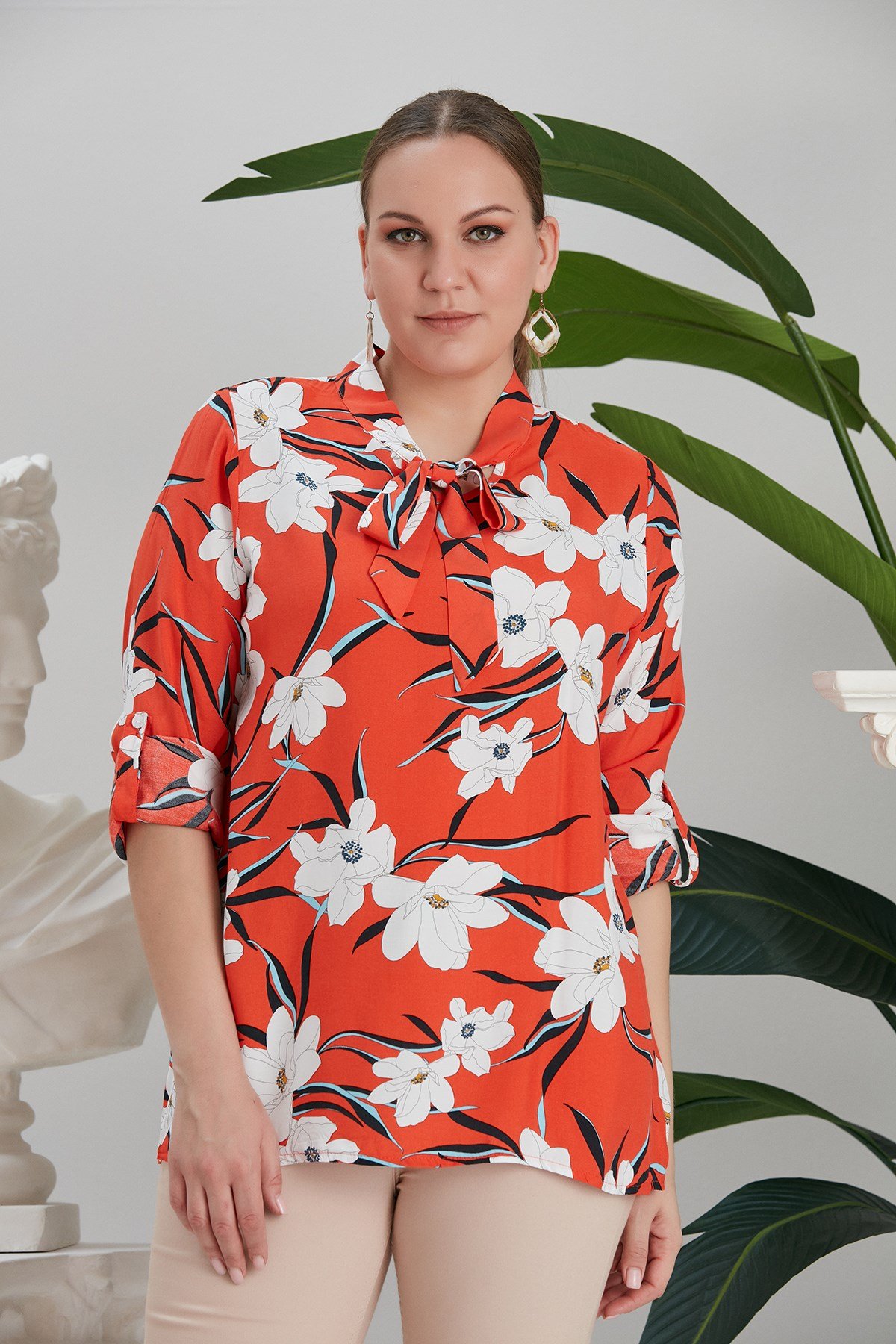Rmg Çiçek Desenli Yaka Detaylı Büyük Beden Mercan Gömlek (O4621-MERCAN)