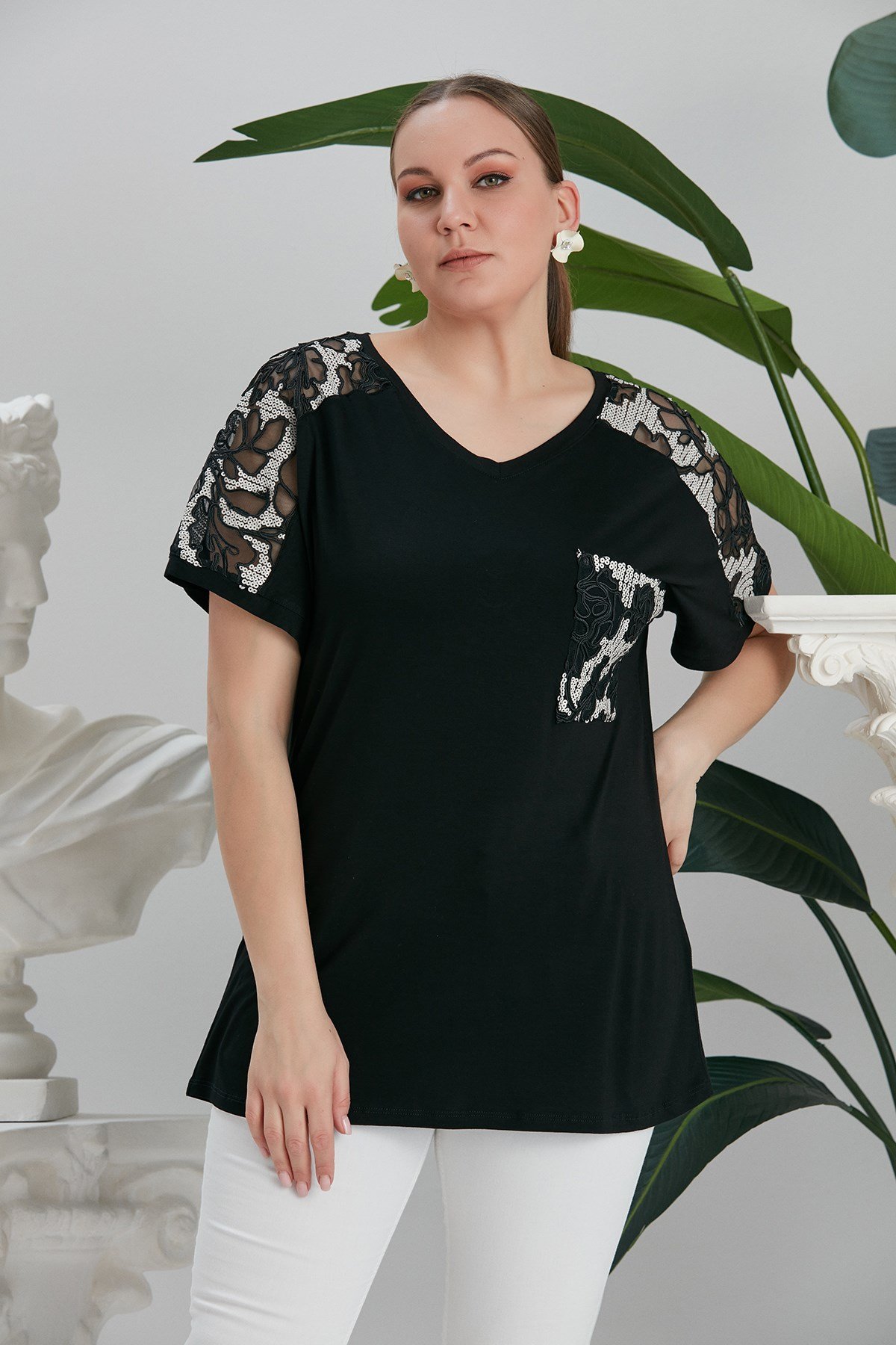 Rmg Dantel ve Pul Payet Detaylı Büyük Beden Siyah Tişört (O4559-SİYAH)